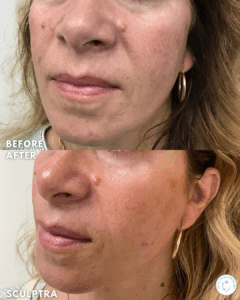 Sculptra is injected into targeted areas using a fine needle or cannula. You may notice a temporary “fuller” appearance right after treatment. This is from the fluid the product is suspended in and will settle within a few days as Sculptra integrates into the tissue.